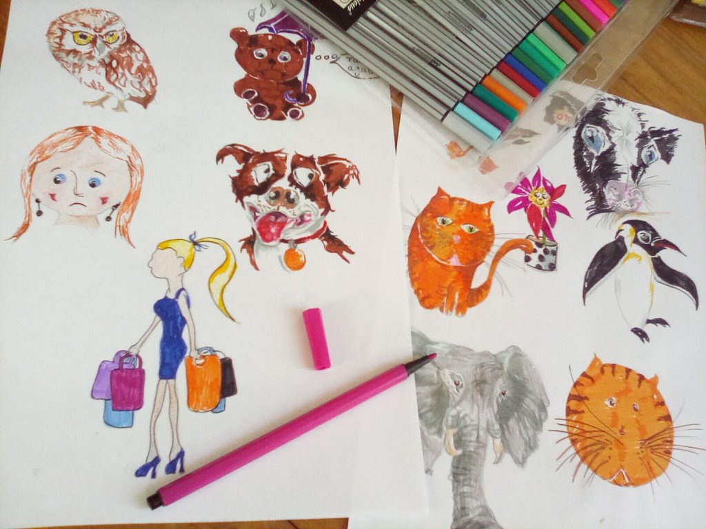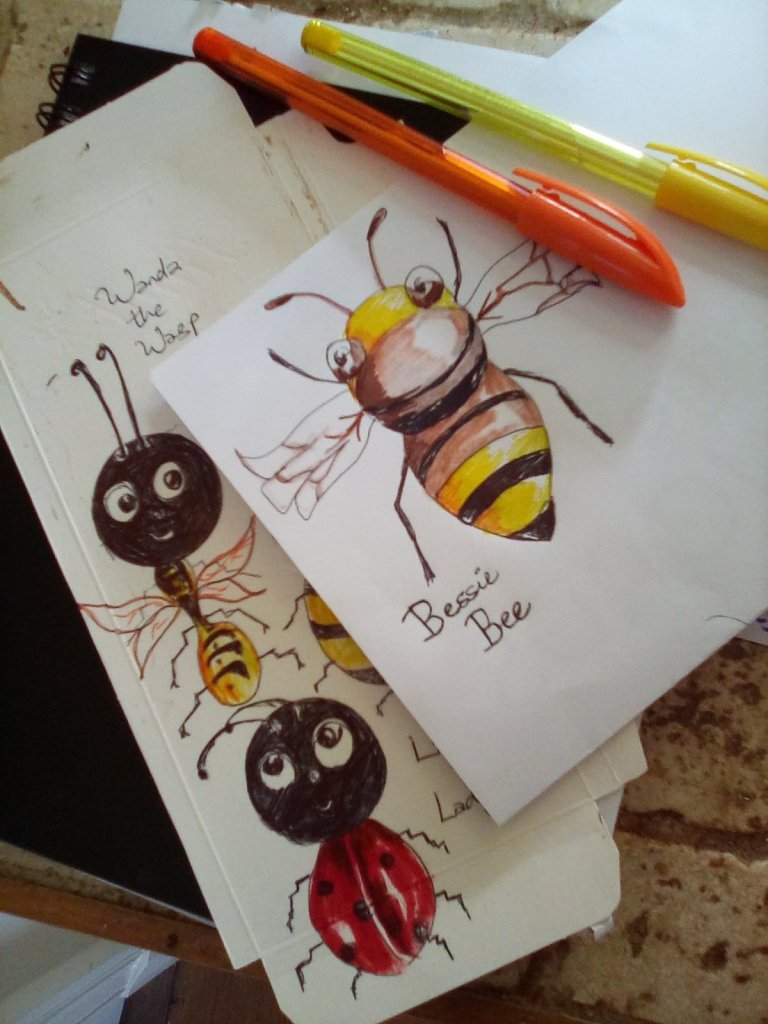 Here are some cartoons. Have a go at drawing some yourselves. Drawing the cartoon insects was fun – a wasp, a bee, a ladybird. With any cartoon or comic drawing, remember to exaggerate, make things larger than life. I exaggerated the wasp’s narrow waist, the dog’s lolling tongue, the woman’s high heels.