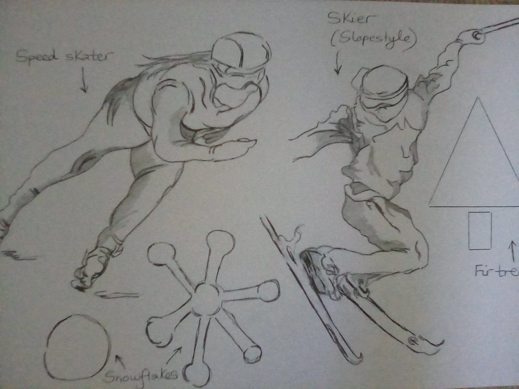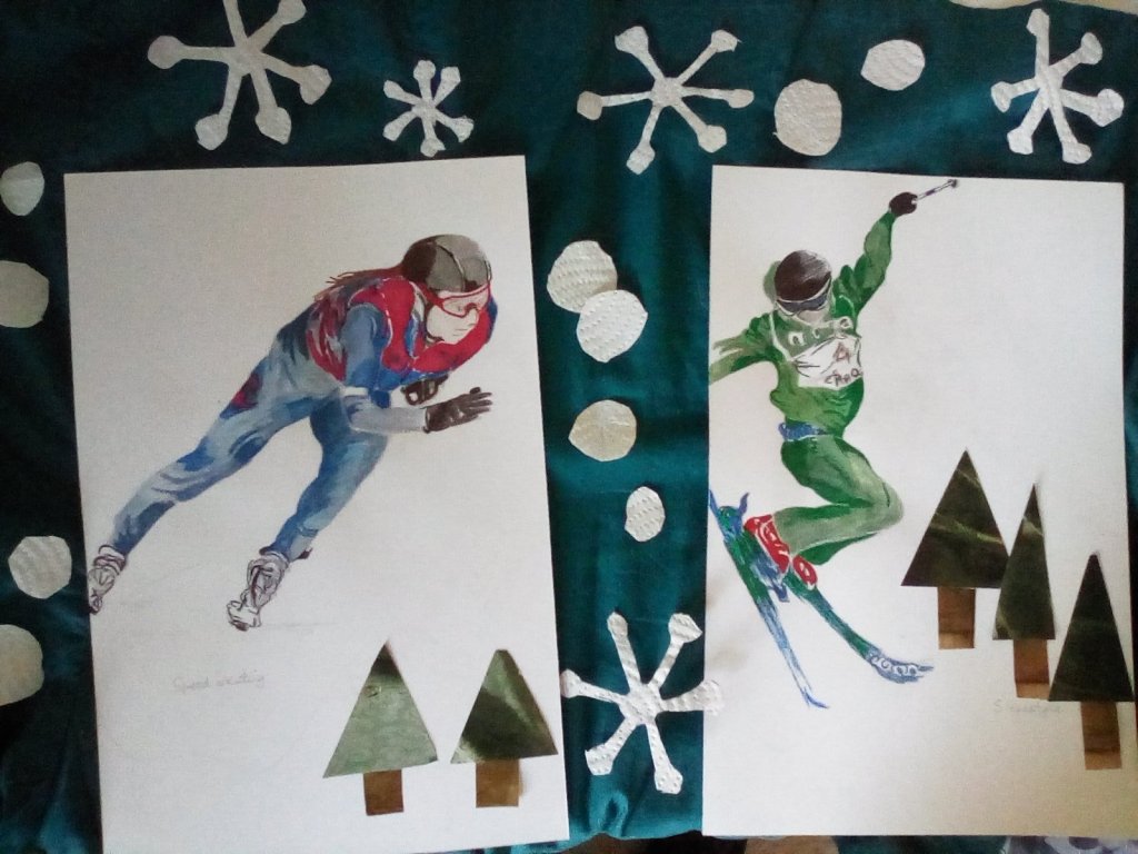 *Draw a simple outline of a sportsperson, athlete or player, running or jumping or preparing, then work it up, adding colour to make a realistic sports drawing. In the picture here you’ll see I’ve drawn two outlines – of an athlete on the starting blocks and of a high jumper – and then worked on these sketches to turn them into fuller drawings. I used colouring pencils and colour pens to add the sports kit the athletes wear and the other details.