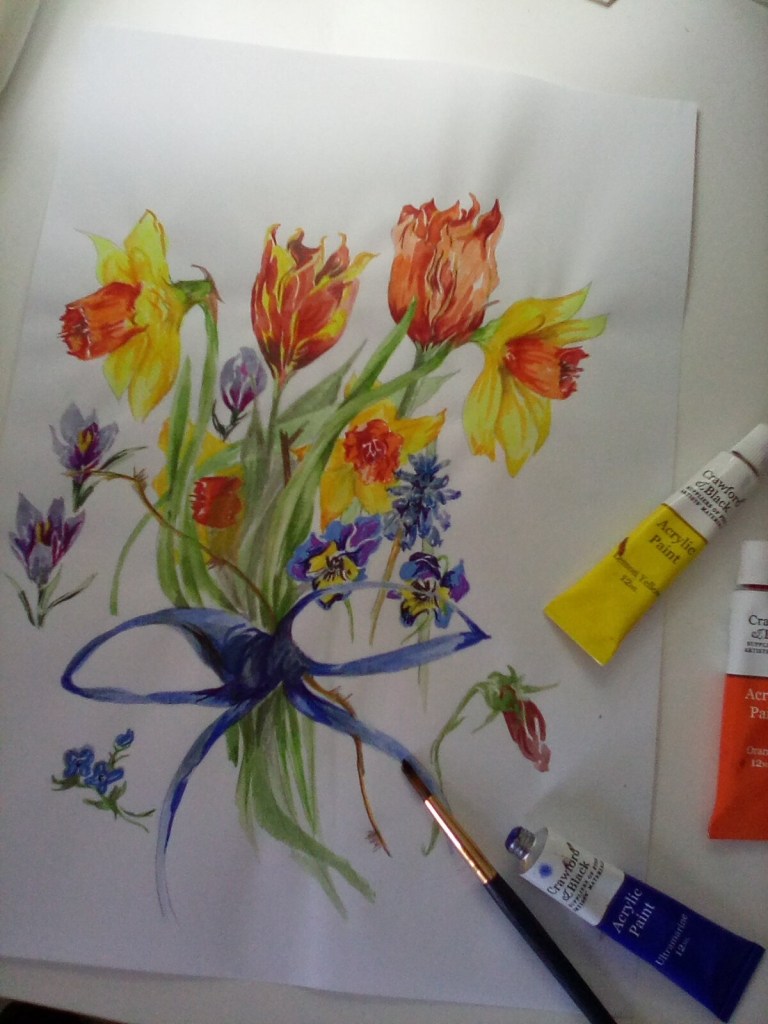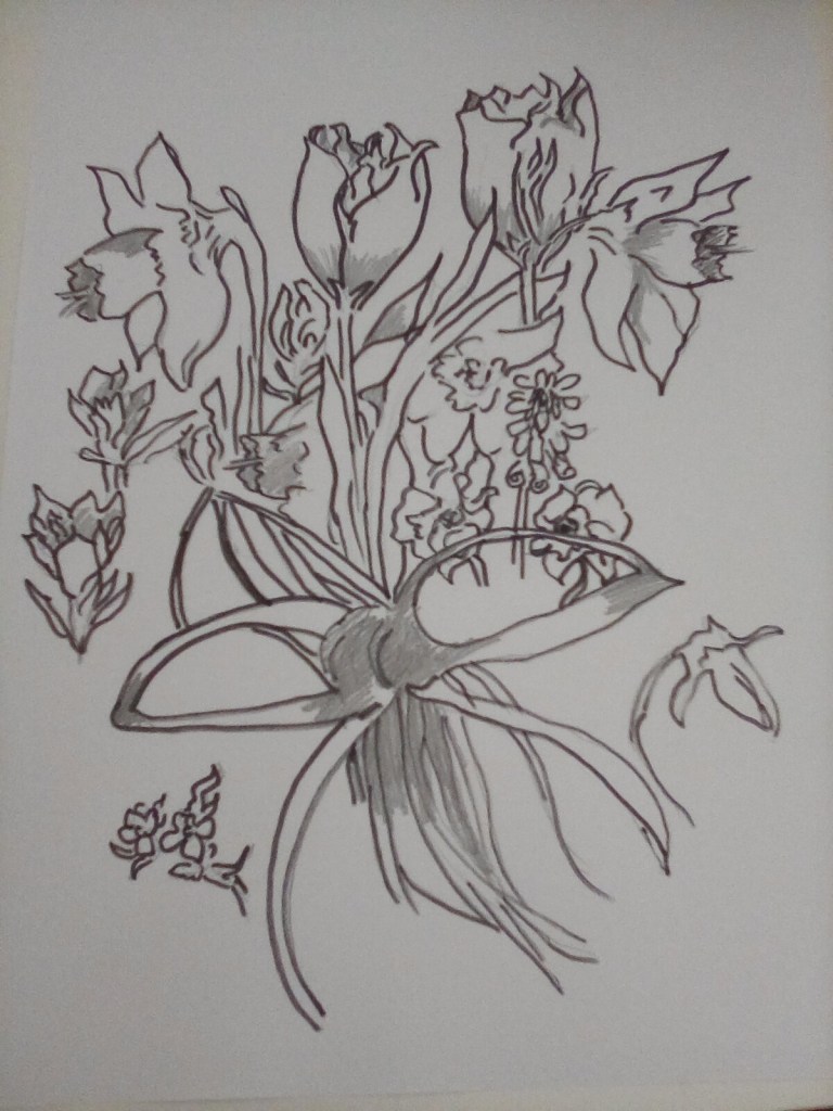 The art idea is to create a floral pattern that forms a heart shape. Lightly sketch a heart outline on your paper, then within the outline draw or paint a flower you like, several times over. You will see in the attached image that I chose a tulip and drew the flowers and leaves to fit the heart shape. At the end, erase the heart outline sketch so that the flowers themselves form the shape.
