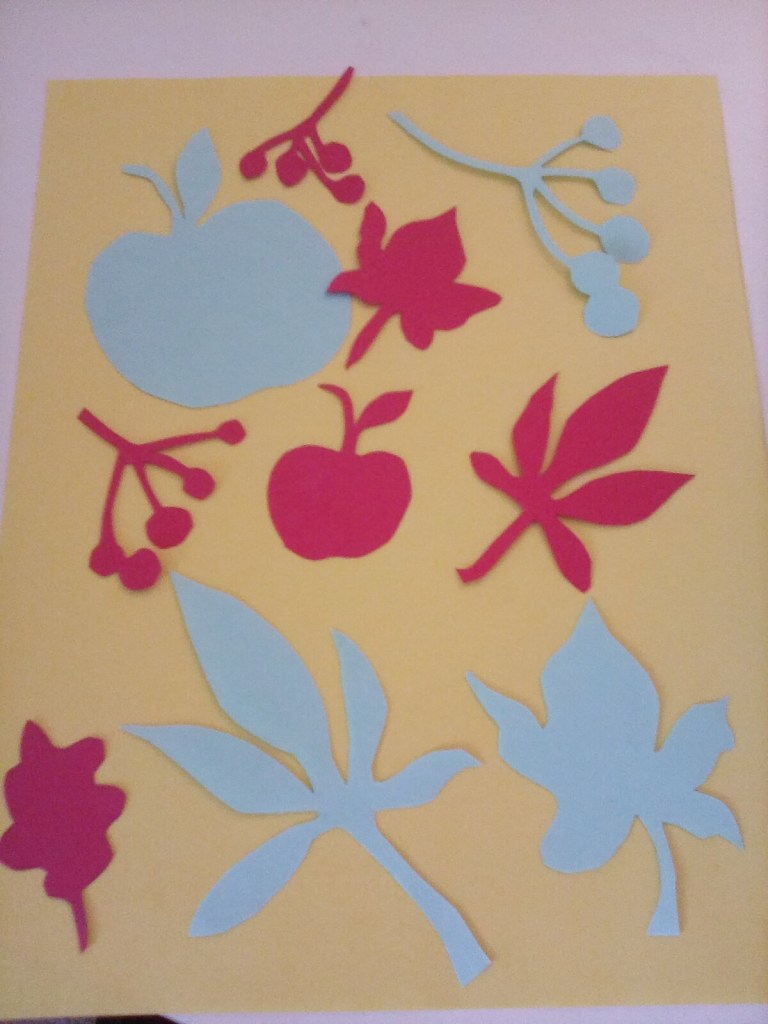 *cut out autumn shapes in colour card or paper, like these – leaves, berries, apples